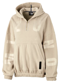The Ronda Rousey Lounger 1/4 Zip has a front pocket, hood and oversized fit that’s so cozy you will never want to take it off. The debossed MIZUNO across the arms and chest combined with the gold zipper are subtle details that elevate this hoodie. The soft touch polar fleece fabric is 100% polyester.